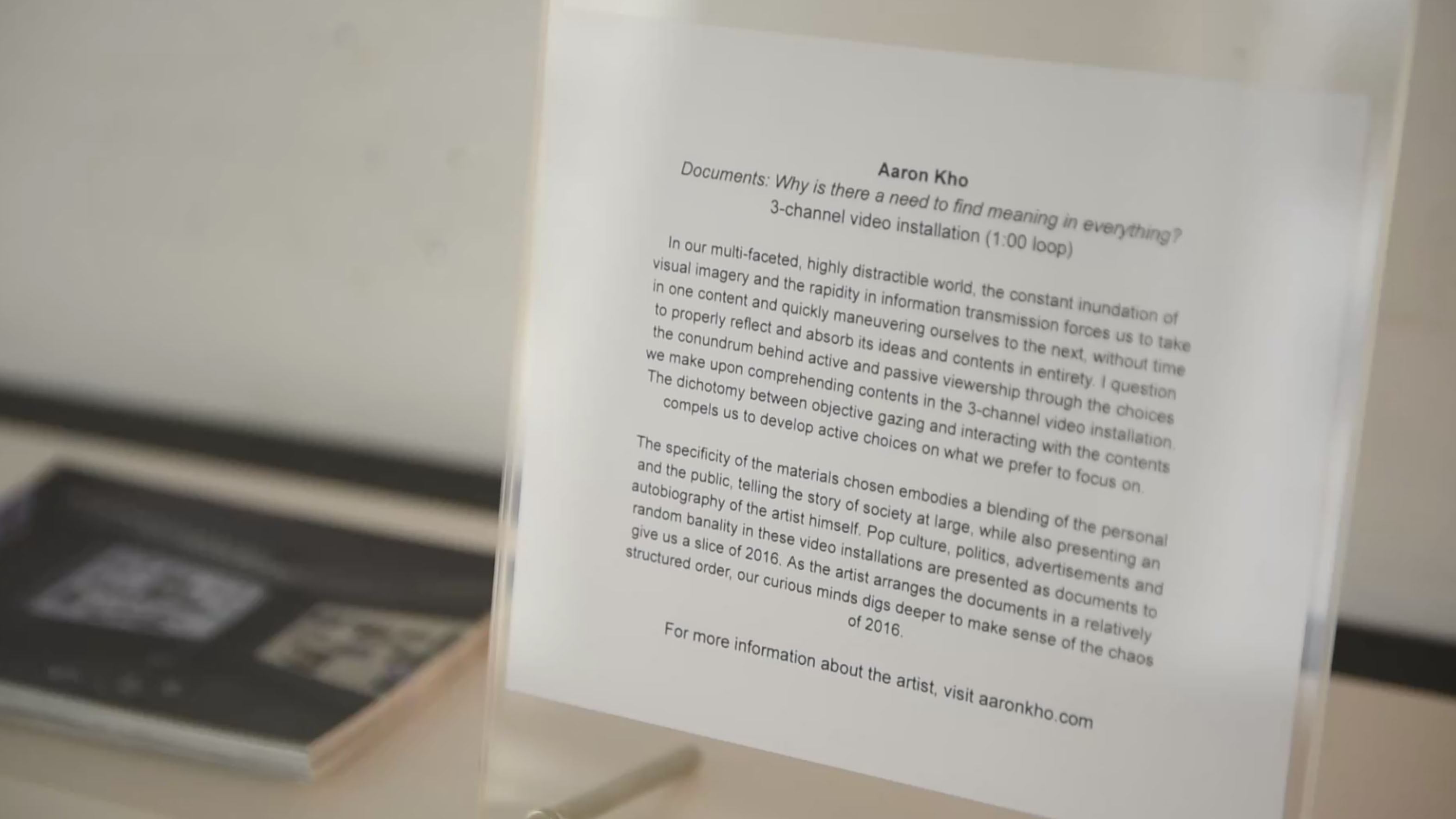 In our multi-faceted, highly distractible world, the constant inundation of visual imagery and the rapidity in information transmission forces us to take in one content and quickly maneuvering ourselves to the next, without time to properly reflect and absorb its ideas and contents in entirety. I question the conundrum behind active and passive viewership through the choices we make upon comprehending contents in the 3-channel video installation. The dichotomy between objective gazing and interacting with the contents compels us to develop active choices on what we prefer to focus on.The specificity of the materials chosen embodies a blending of the personal and the public, telling the story of society at large, while also presenting an autobiography of the artist himself. Pop culture, politics, advertisements and random banality in these video installations are presented as documents to give us a slice of 2016. As the artist arranges the documents in a relatively structured order, our curious minds digs deeper to make sense of the chaos of 2016.
